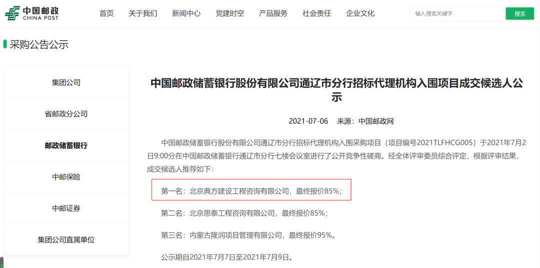 2021年7月2日,經中國儲蓄銀行股份有限公司通遼市分行全體評審委員綜合評定后,發布了招標代理機構入圍項目成交候選人公告,遠瓴數據集團旗下子公司北京典方建設工程咨詢有限公司以第一名成績成功入圍!成為中國儲蓄銀行股份有限公司通遼市分行代理商之一,服務期自合同簽訂之日起3年,承擔該分行采購項目的代理工作。
